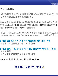 Computer73 DDoS(좀비 PC) 전용 백신. 자료 출처 : 안철수 연구소 (http://www.ahnlab.co.kr) 말 많은 DDoS의 공격이 다시 시작됐고, 오늘 하드 파괴가 시작되었다. 위 이미지의 설명대로 현재 사용중인 PC는 전용 백신으로 바로 검사를 시작하고, 최근 사용하지 않았던 PC는 반드시 안전모드로 부팅을 해 2월 15일 정도로 날짜를 수정하여 부팅한 뒤, 전용 백신으로 검사/ 치료를 하여야 한다. 안전모드 부팅방법은 PC 전원 인가 후 F8키를 누르면 된다. 언제쯤 눌러야 할지 모르겠으면 전원을 넣은뒤 F8키를 계속 연타해준다. 안전모드로 부팅후 화면 오른쪽 아랫부분의 시계를 더블클릭해 현재 시간을 넉넉히 2월15일 이전으로 변경해주고, 재부팅 한부 안철수 연구소 홈페이지나 아래 첨부 파일을 받은뒤 검사를 진행해준다. 안전모드.. 2011. 3. 6. AMD SB7xx / SB8xx Raid 드라이버 설치 방법 WD의 SATA3를 지원하는 1TB하드를 구매했으나 기대만큼 성능이 나오질 않아 RAID0을 구성해 보았다. raid 구성에 사용된 하드는 seagate의 320G 두장. 우려했던대로 레이드 드라이버 설치에 많은 시간이 소요되었다. 알고 나면 별것도 아닌것을. 본인의 메인보드는 바이오스타의 TA890FXE. 890FX 칩셋과 SB850 칩셋이 사용됐고, raid 0 / 1/ 5 / 10 이 지원된다. 시모스 세팅에서 SATA3모드를 활성화 시키면 인식/ 설치 오류가 발생한다는 글을 본적이 있으나, sata3 모드를 활성화하고 설치 했음에도 인식이나 설치에 문제는 발생하지 않았다. 시모스에서 raid 모드로 설정을 하고, 부팅시 Ctrl+F 키를 누르면 raid 구성설정을 할수 있다. 4가지 메뉴가 뜨는데.. 2011. 3. 2. 커세어 AX750 Gold Corsair Professional Series AX750 Gold 흔히 커간지라 불리우는 커세어사의 80+ Gold 등급의 750W 파워 서플라이. 영감 컴퓨터에 들어간 슈퍼플라워 SF600을 보며 또다시 찾아온 지름신과 때마침 찾아온 파워 이상으로 인해 또 질러버렸다. 이전에 쓰던 모델은 이엠텍 Black Devil 530+ 모델. 처음엔 이상없었으나 차츰 커져만 가는 소음. 쿨러에서 나는 소리인지 고주파음인지 모를 이 소리는 모기 7~8마리 정도가 귓가에 앵앵 거리는 소리로 착각하게 만든다. 뉴젠 프라임 500W가 한달만에 사망해 버리고, 고르고 골라 나름 가격대비 우수하다는 이놈을 골랐건만 이 마저도 6개월을 못넘기고 파워에 이상이 생겨버렸다. 원래 소음따위엔 무딘 나지만, 컴터를 킨 직후부터 .. 2011. 2. 26. 영감PC 업그레이드 샌디가 어쩌고 저쩌고. p67칩셋이 버그가 어쩌고 저쩌고. 한번 PC구매할때마다 한두달 정도 날 들들 볶는 영감이 있다. 그 영감이 이번에 또 PC 지름신이 오셨다. 견적 견적 노래를 부르길래 5분만에 견적 뽑아 제출해 버렸다. CPU : AMD 투반 X6-T1055 RAM : 삼성 DDR3 10600 4G * 2 MB : ASUS 890GX Pro VGA : MSI R6850 PE/OC 1G HDD : WD 1TB SATA3 ODD : 삼성 223C Power : Super Flower SF-600P14XE Case : Zalman Z9 Plus 대충 견적 110정도가 나왔다. 하지만 이런 사양에도 만족못하는 영감. CPU는 무조건 1090을 하시겠단다. 뭔가 대단한 게임을 하시는분 같지만, 하는건 니.. 2011. 2. 26. 이전 1 ··· 6 7 8 9 10 11 12 ··· 19 다음